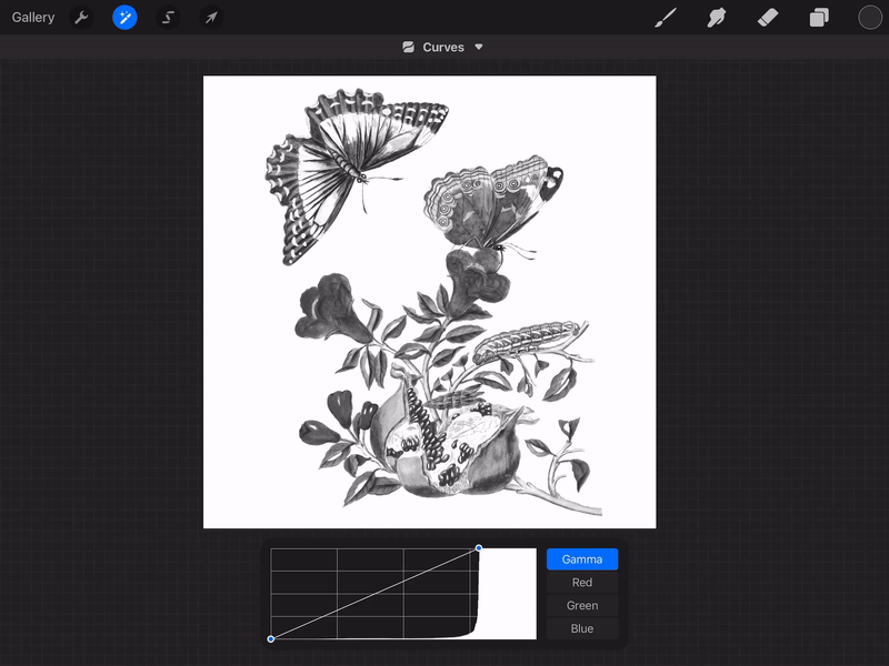 Next, go into Curves and slide the top right node over to lighten the background until it’s white. Remember, we use black and white images (and gray) for brush-making.